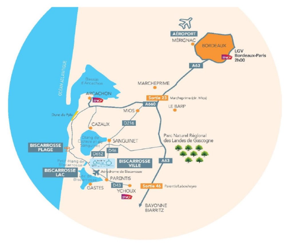 - A 20 mn de la Gare SNCF d’Ychoux : 4 trains journaliers pour Bordeaux (40mn), mais aussi Dax et Mont-de-Marsan