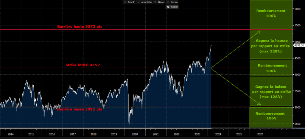 – un Twin-Win sur Euro Stoxx 50, 106% capital garanti, avec une maturité novembre 2026.
