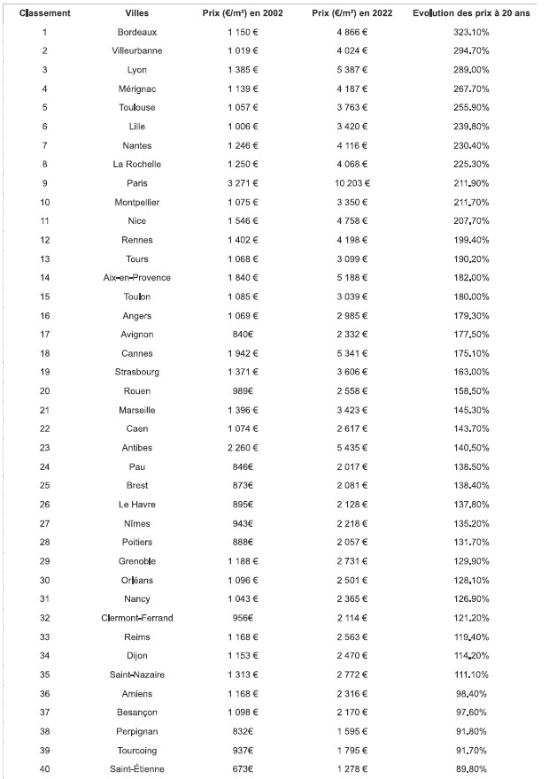 - Bordeaux : Cette ville a connu une hausse impressionnante, avec une augmentation de plus de 200 % sur 20 ans, et une progression significative ces dix dernières années.