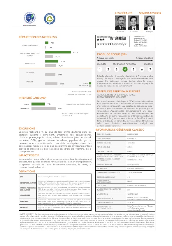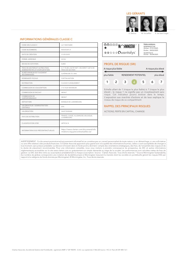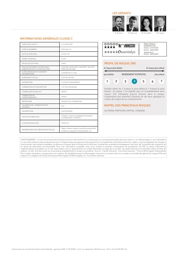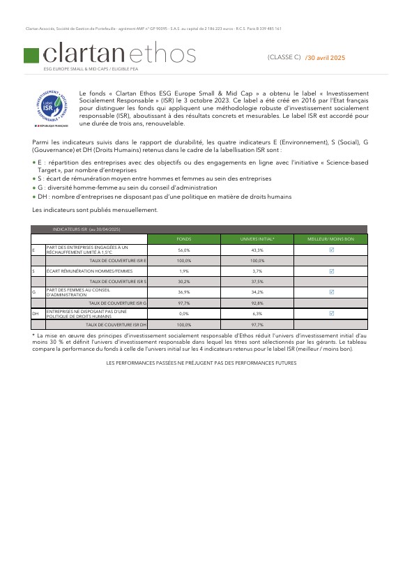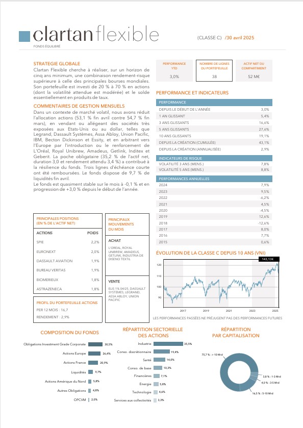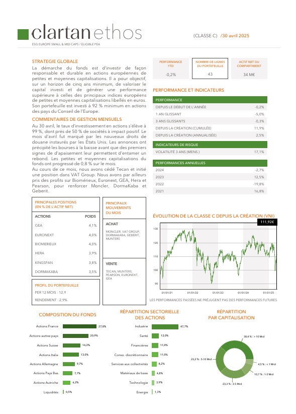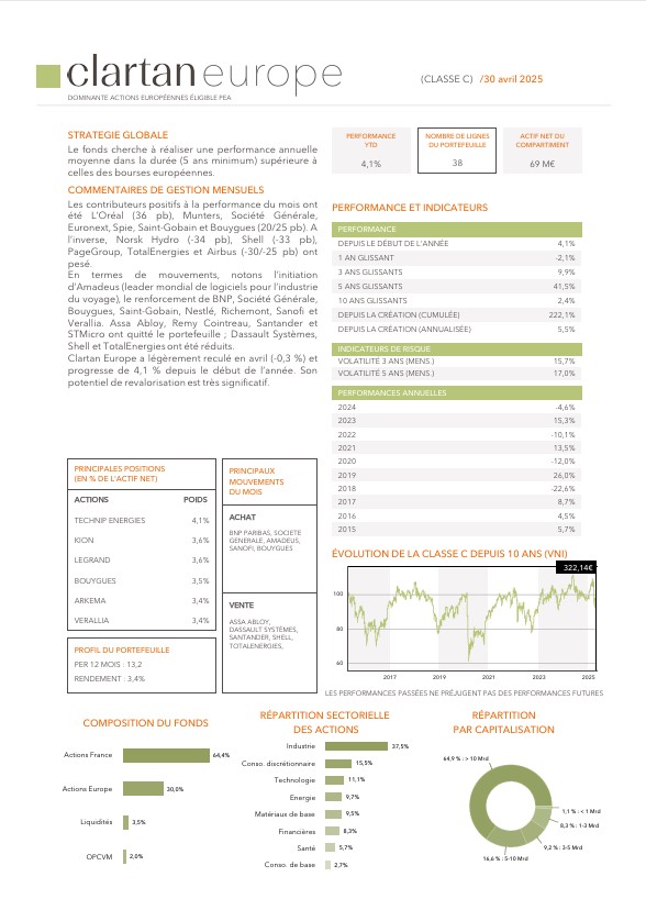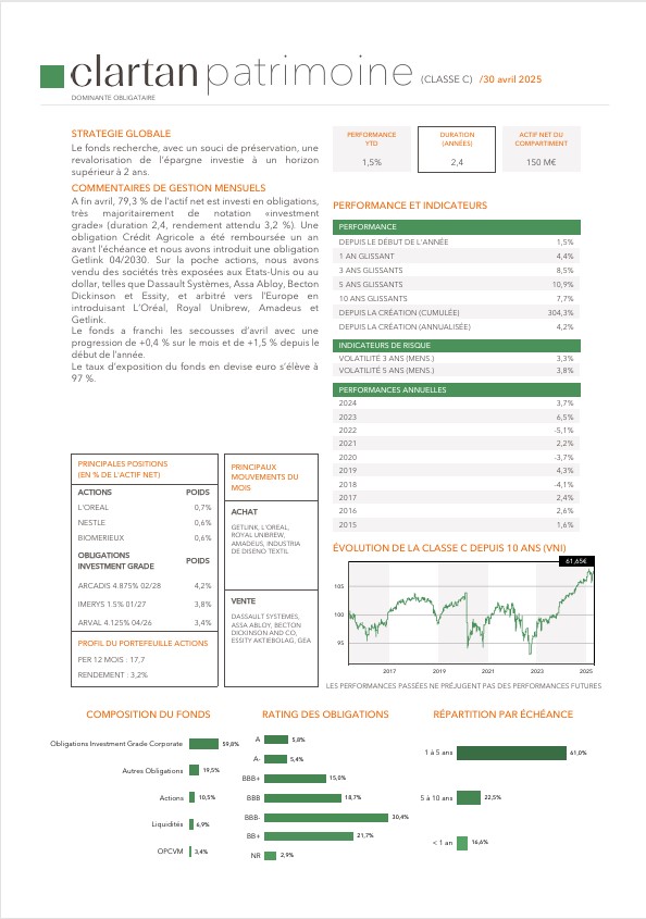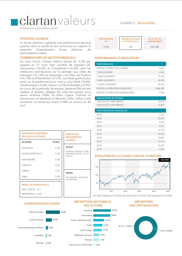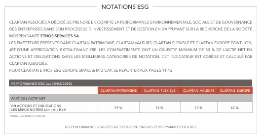 Les performances des fonds Clartan en avril ont été contrastées. Valeurs baisse de -2,5 %, Europe de -0,3 % et Flexible de -0,1 %. D’un autre côté, Patrimoine progresse de +0,4 % et Ethos de +0,8 %.